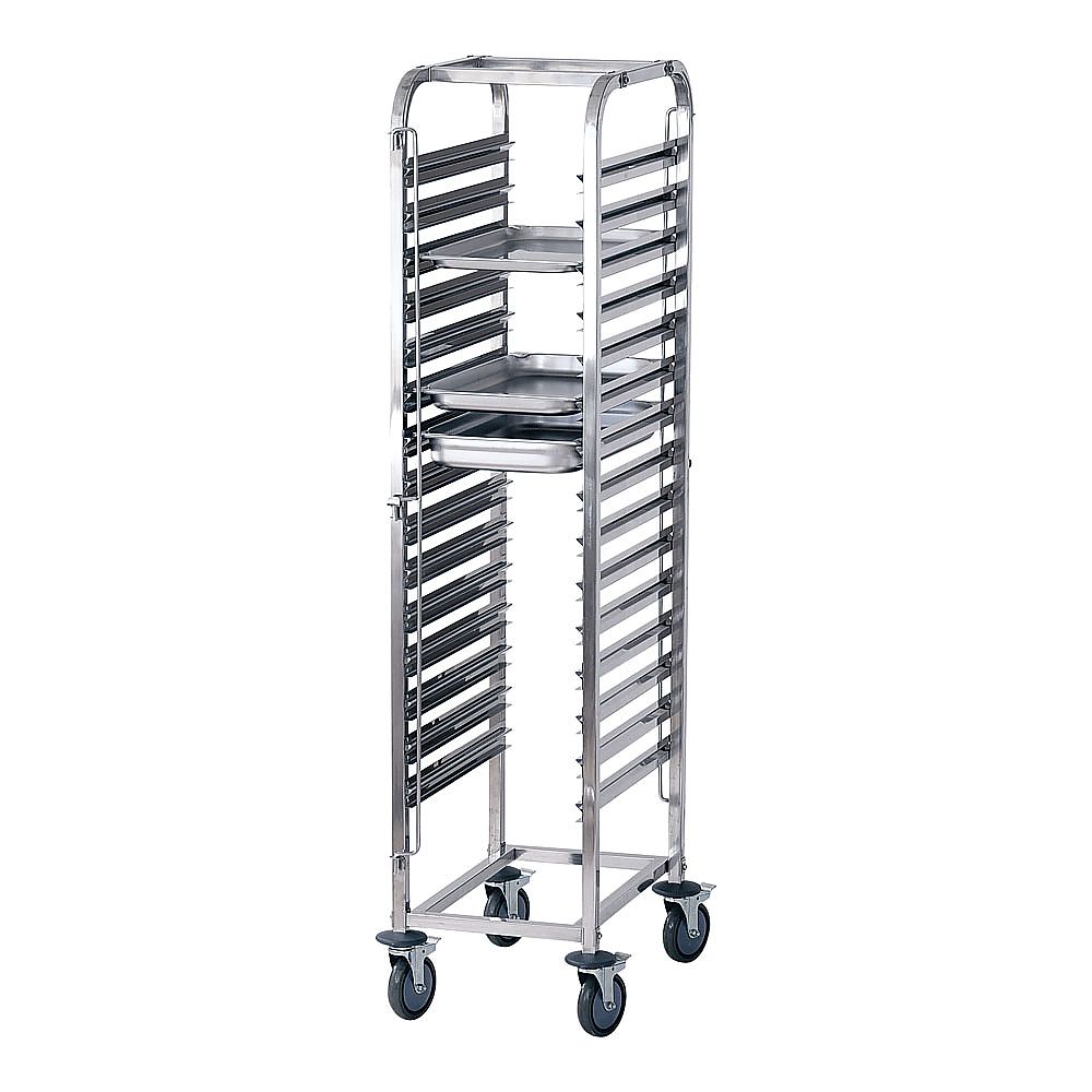 ●TKGフードパントローリー(ホテルパンラックカート)今や運搬・保管の必需品!「組み立て済み」ガストロノームパンやホテルパン専用のカートです。運搬はもちろん、穴明パンやグリット網といった意外と多いコンベクションオーブンの備品類の保管にも便利です。