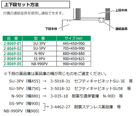 ●従来のステンレス・スチール製の薬品庫と互換性のあるサイズですので、上段として相互連結が可能です。