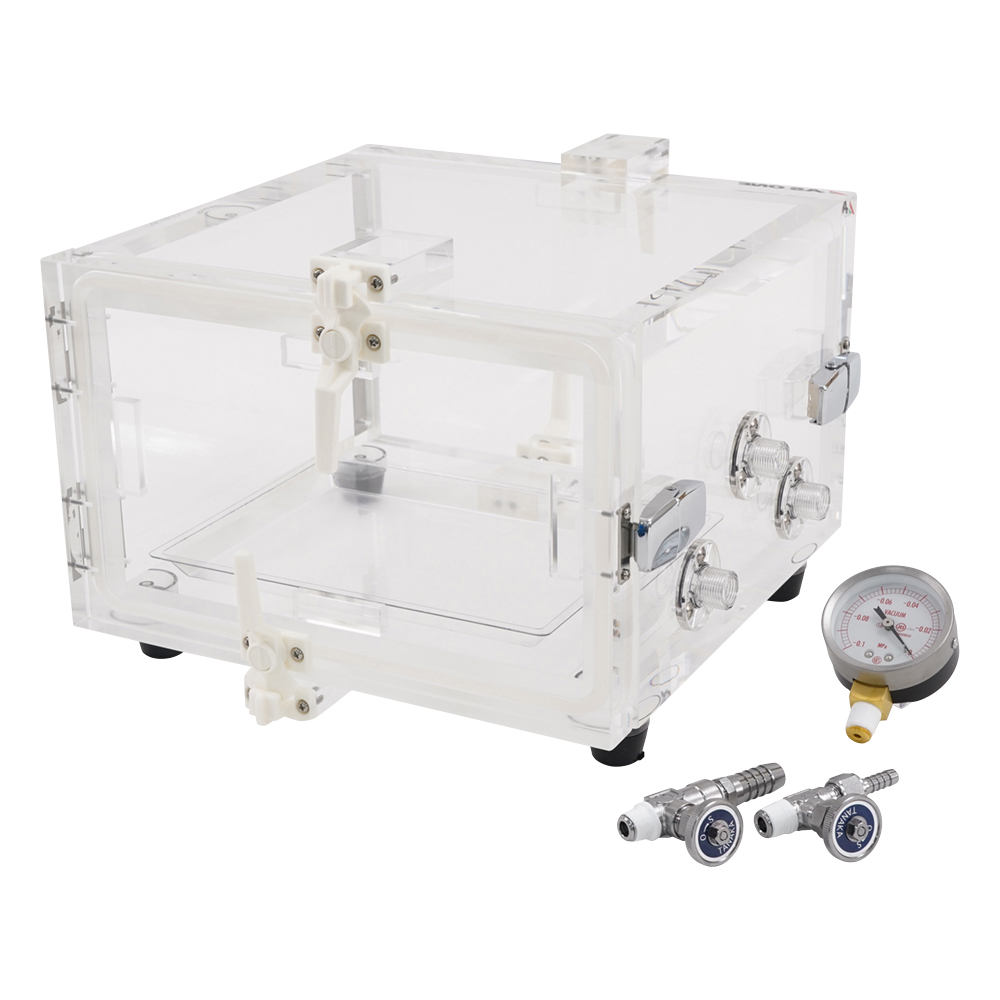 ●材質:本体/PMMA(アクリル樹脂)(板厚:25mm)、 バルブ・真空計取り付け座/PC(ポリカーボネート)