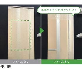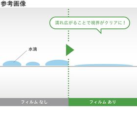 ●浴室等でフィルム表面に水をかける事で親水効果を発揮し、水滴が玉にならず濡れ広がる事で視界を確保できます。