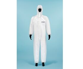 ●ポリプロピレンメルトブロー不織布を2重にし、ポリプロピレンスパンボンド不織布で挟み込んだ構造で、高いバリア効果と通気性に優れた防護服です。