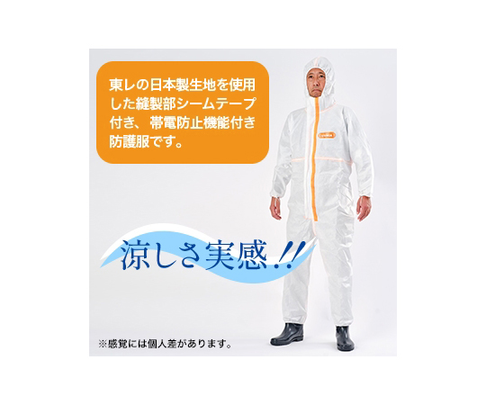 ●独自のSMS 製法※2 により粉じん防護性と耐水圧1,000mmH₂O※3 に加え、通気性、帯電防止機能を有する新しいタイプの防護服で縫い目部分にシームテープを付けています。