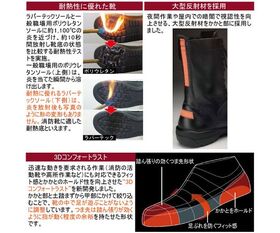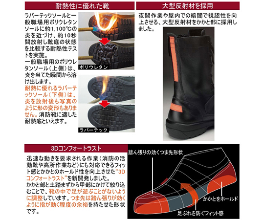 ●迅速な動きを要求される作業(消防の活動靴や高所作業など)にも対応できるフィット感とかかとのホールド性を向上させた「3Dコンフォートラスト」を新開発。かかと部と土踏まずから甲部にかけて絞り込むことで、靴の中で足が遊ぶことがないように調整しています。つま先は踏ん張りがきくように指が動く程度の余裕を持たせた形状です。