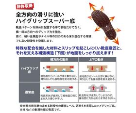 ●靴底パターンを斜めに配置する事で前後だけでなく、横・斜め方向へのグリップ力を強化。更に、硬い金属面やタイル等の凹凸がある床が混在する環境でも高い耐滑性を発揮します。