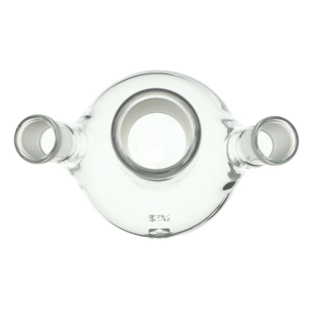 ●3ヶ所に接続口がある球状をしたガラス製のフラスコです。
