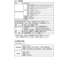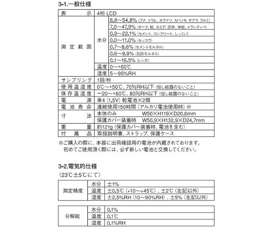 ●測定精度:±1%(水分率)、±0.5℃(温度・10~+45℃)、±2.5%RH(湿度・10~90%RH)