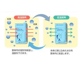 ●高湿度時には湿気を吸収し、低湿度時には湿気を放出する可逆性により、一定の湿度に調整します。この調湿動作により長期間、除湿効果が持続し、結露対策などに効果があります。