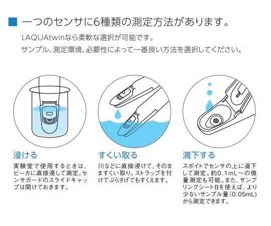 ●0.1mLからの微量試料を平面センサに滴下するだけで測定可能(ビーカー要らずで、どこでもすぐに測定できます。)