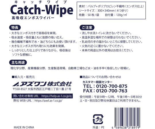 ●パルプとポリプロピレンの複合繊維不織布で、水・油どちらも拭きとります。