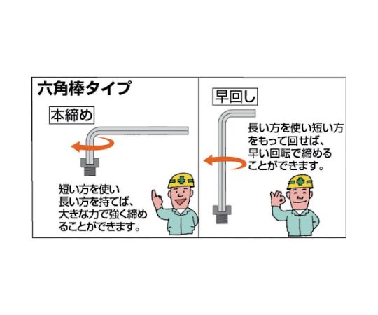 ●短い方を使い、長い方を持てば、大きな力で締めることができます。また長い方を使い、短い方を持って回せば、早い回転で締めることができます。