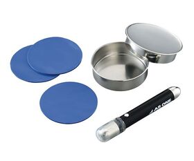 ●ペンシル型のふるい機とフタ付き受器、防振シートのセットです。