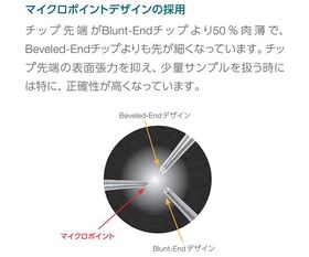 ●▼チップ先端の表面張力を抑え、少量サンプルを扱う時には特に、正確性が高くなっています。
