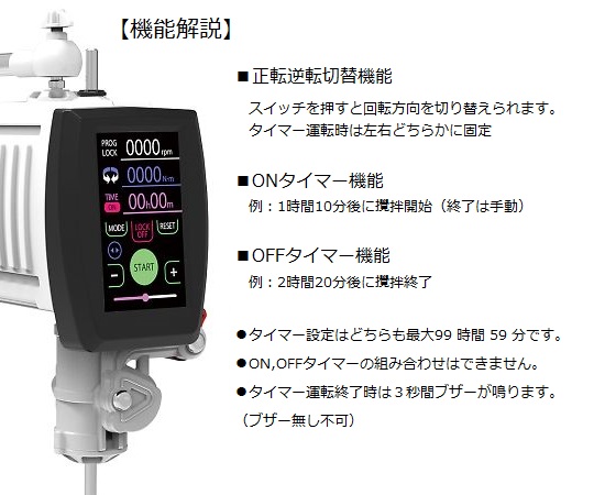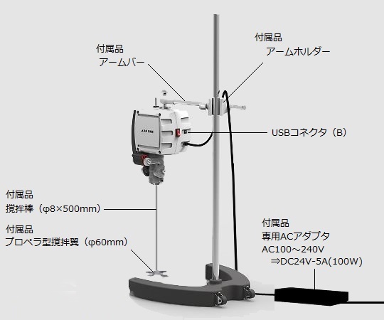 ●付属品:プロペラ型撹拌翼(60mm)、撹拌翼固定ナット、撹拌棒(φ8×500mm)、アームホルダー、アームバー