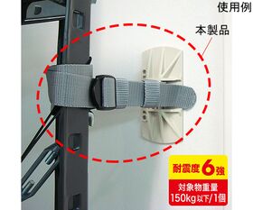 ●ベルトの一端に設けられた接着パッド付きベースを壁面や床面に接着固定し、ベルトの他端をオープン棚の支柱や棚板に巻き付けて使用します。