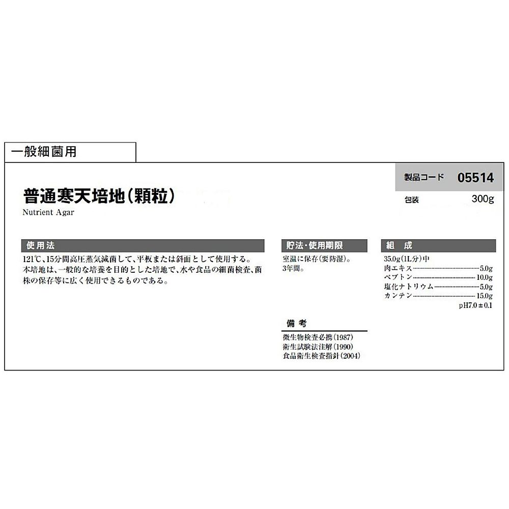 ●本培地は、一般細菌の培養を目的とした培地であり、もっとも基本的な組成(肉エキス、ペプトン、塩化ナトリウム、寒天)の培地の1つである。