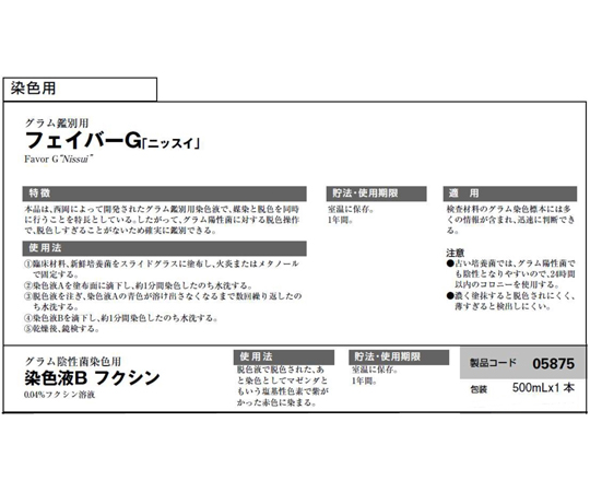 ●本品はグラム陰性菌染色用の0.04%フクシン溶液である。