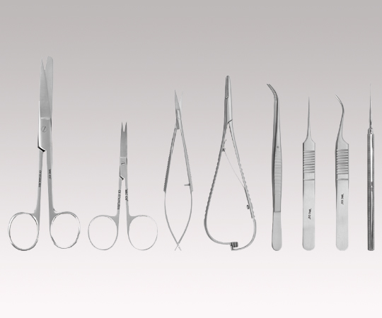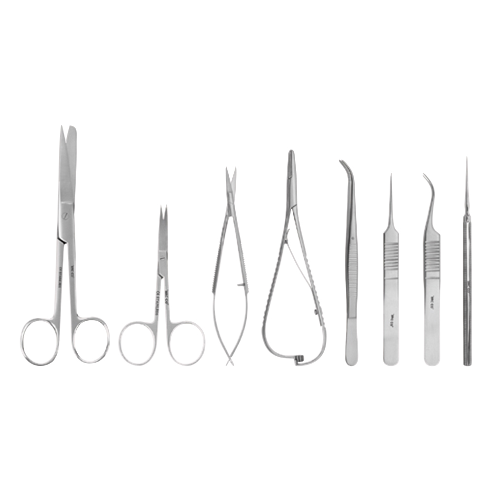 ●セット内容(各1本):外科手術剪刀14.5cm直・片鋭、デリケートピンセット(セムケン)12.5cm湾曲、マイクロピンセット11.5cm・No.5・直、マイクロピンセット11.5cm・No.7・湾曲、ニードル13cm、アイリス剪刀10.5cm直、マイクロスプリング剪刀12cm、マッチュー持針器14cm