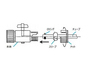 ●バイトン(R)Oリングが接続ネジ部とロックキャップの間に入っており、使用するチューブの端をバイトン(R)OリングとOリング押さえに通し、ロックキャップを締めて接合します。
