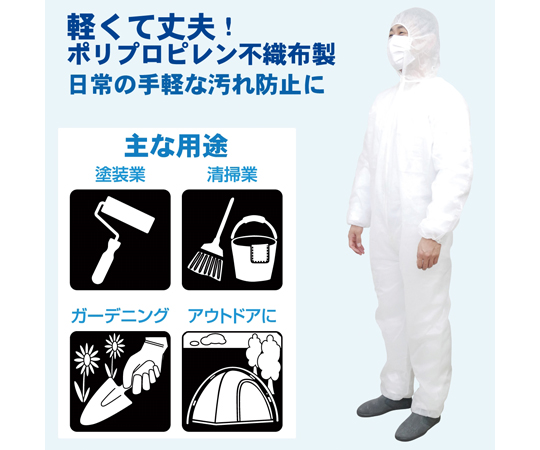 ●軽くて丈夫なポリプロピレン不織布製のつなぎ服(作業服)です。