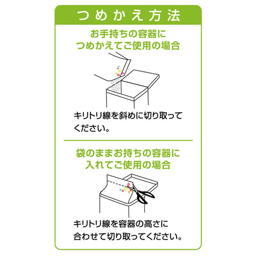 ●省資源化のため、計量スプーンは入れておりませんので、お手持ちの洗剤計量スプーンをご使用ください。ご使用の際は、計量スプーンの容量とあわせて、洗濯機の取扱説明書を必ず確認の上、ご使用ください。