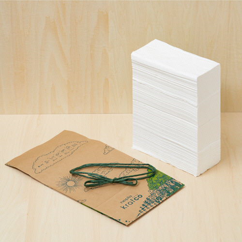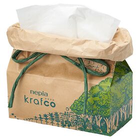 ●kraft(クラフト紙)+eco(エコ)で「krafco(クラフコ)」。ティッシュを包装する材料(包装資材)を紙由来のみ(クラフト紙と紙ひも使用)にすることで分別する一手間をなくしました。また、脱プラスチック(脱フィルム)・ゴミの削減にもつながる、エコへの想いを込めた商品です。