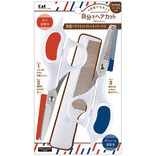 ●長さ調整用のカットハサミ、ボリューム調整用のスキハサミとコームがセットになっています。