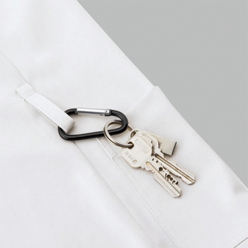 ●男女兼用、静電気防止、左胸片玉縁ポケット、両脇アウトポケット、両脇スリット入、右脇ウエストにループ付