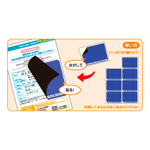 ●台紙からラベルをはがして、手持ちのはがきに貼るだけで、情報を保護することができる目隠し用ラベルです。ラベル一枚ごとに切り離せるように、台紙にミシン目が入っています。表面は地紋入りなので面倒な印刷はまったく不要。