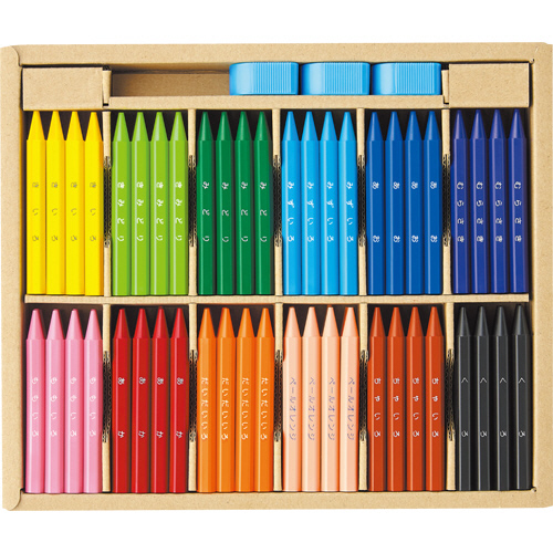 ●材質/色軸:顔料・体質顔料・ワックス・樹脂、中仕切・個箱:紙、削り器:PS、刃:鉄