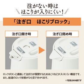 ●ロックボタンと連動して注ぎ口が開閉するためほこりなどが入りにくい構造です。また、給湯のロック状態がひと目で分かります。