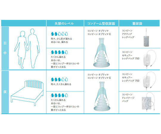 ●▼コロプラストがご提案するおむつにかわる男性用尿失禁管理の選択肢は、コンドーム型収尿器と蓄尿袋を組み合わせてご使用いただくコンビーンシリーズです。ペニスに直接装着するコンビーンコンドーム型収尿器を、コンビーン外部蓄尿袋(別売り)に接続して使用します。コンビーンコンドーム型収尿器は衛生上、1日に1回交換してください。おむつと違い、服の下で目立たず、ゴミも減らせます。