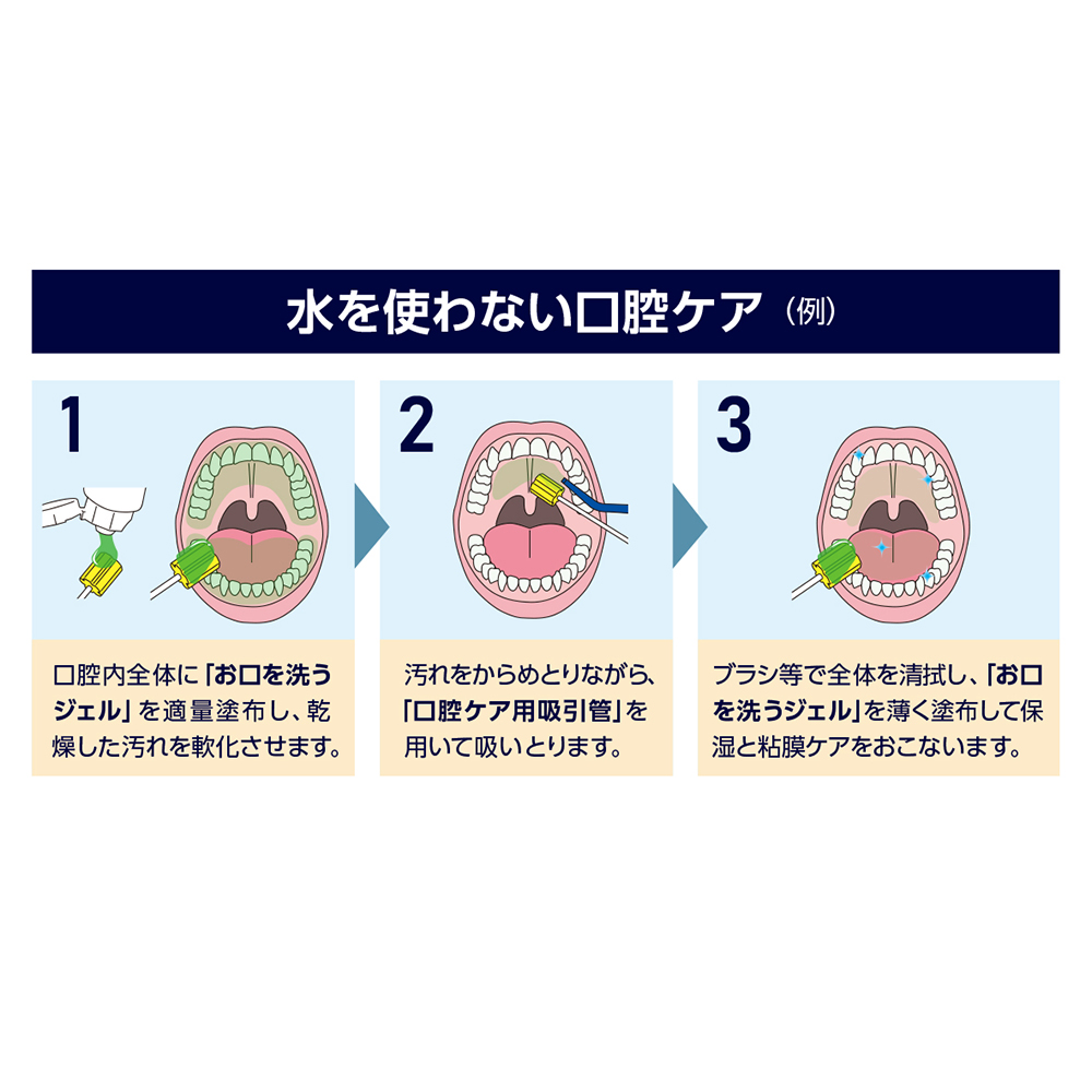 ●お口を洗うジェル(口腔ケア用ジェル)との併用により、誤嚥の心配がある患者さんに対して “水を使わない口腔ケア” を行うことができます。