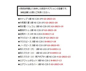 ●付属品:ネブライザーキット×1組、吸水管・バッフル(予備用)×1個、送気ホース×1本、交換用エアフィルター×5個、マウスピース×1個、吸入マスク(小)×1個、吸入マスク(小)用アダプター×1個