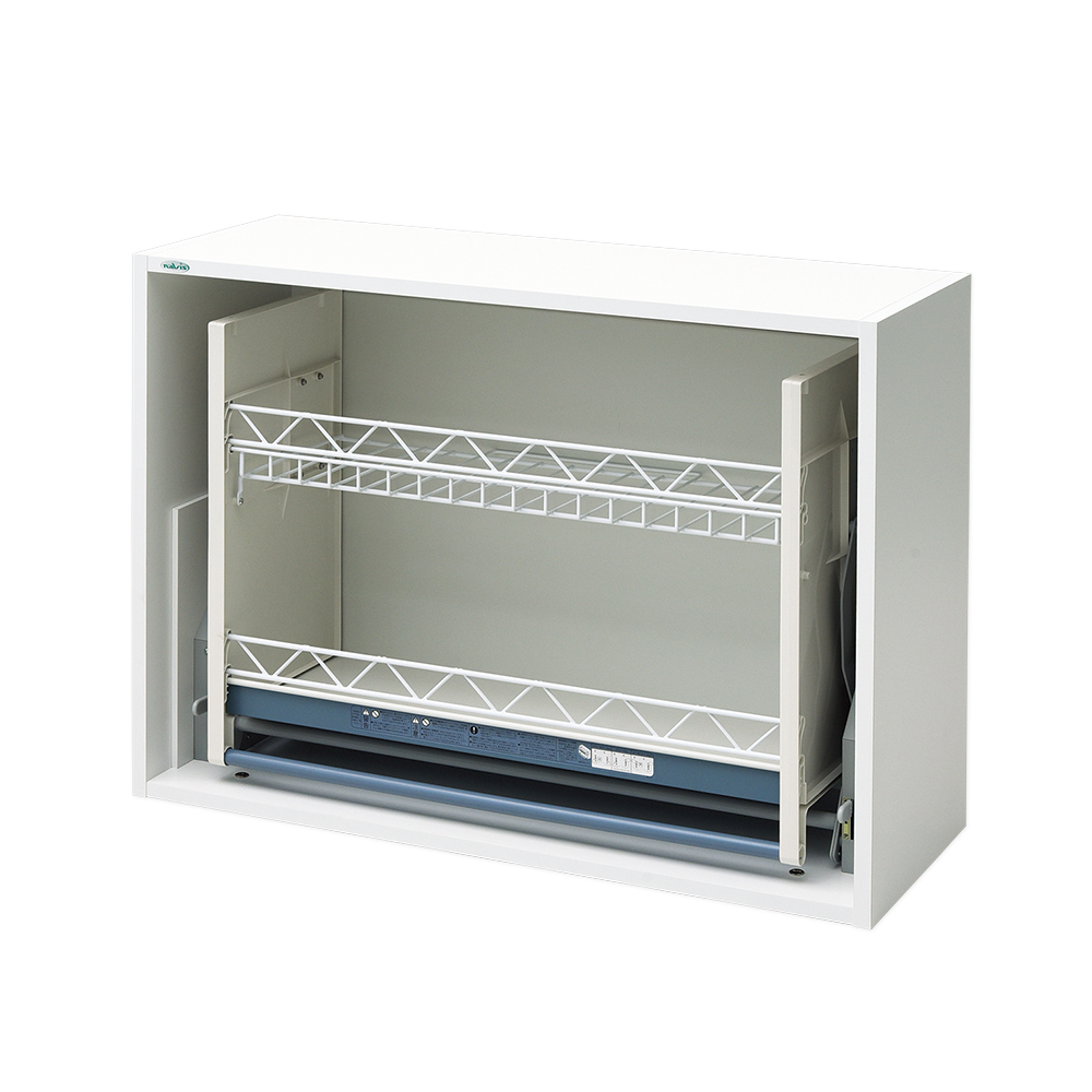 ●仕様:昇降ダウンウォール本体/プリント合板、天板/メラミン化粧合板、樹脂トレー/PS(ポリスチレン樹脂)