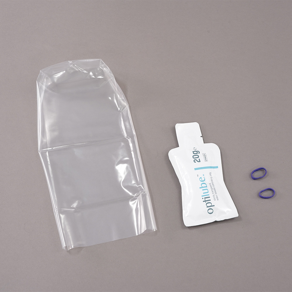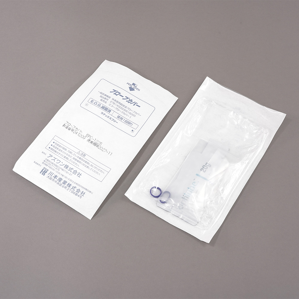 ●セット内容(1袋):プローブカバー×1枚、固定用ゴムバンド×2本、滅菌ジェル20g×1袋