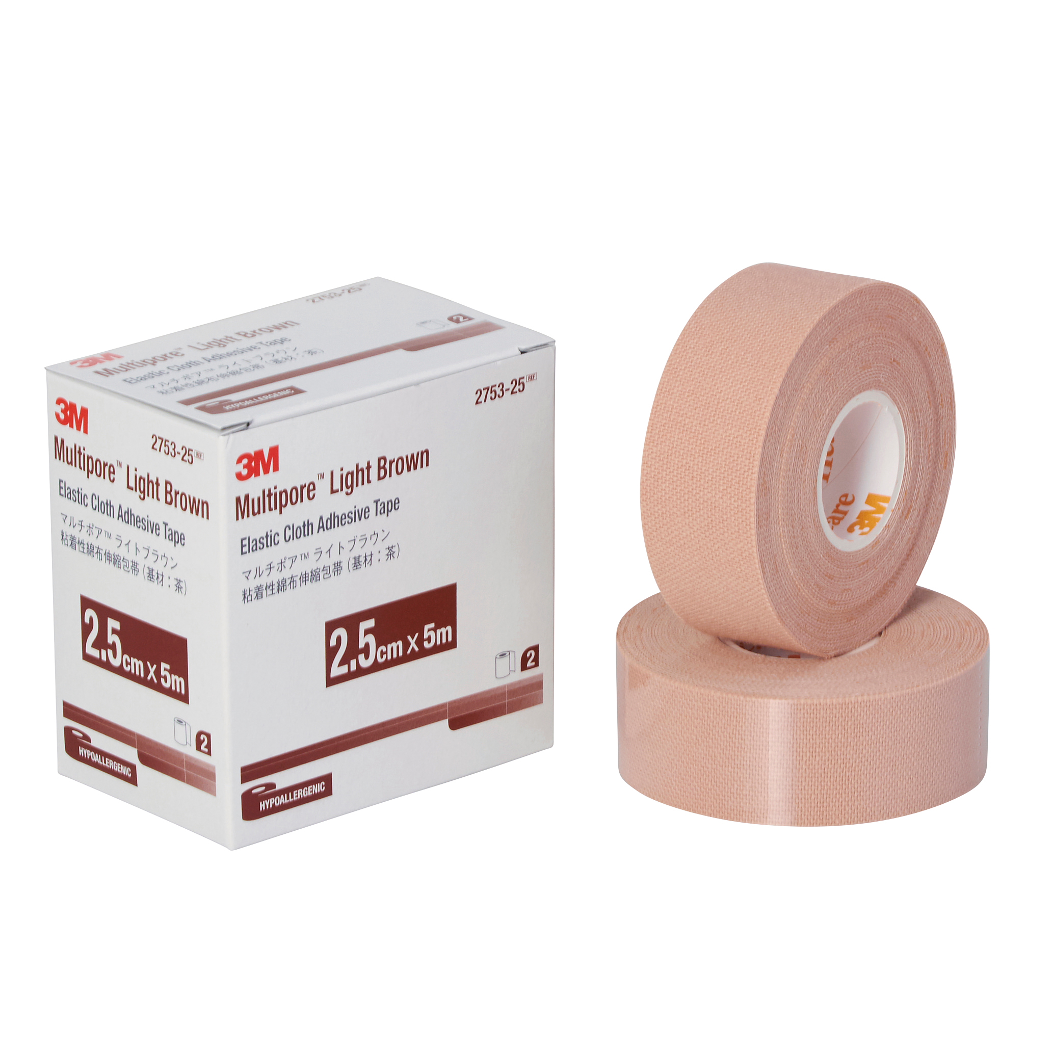 マルチポア(TM) ライトブラウン粘着性 綿布伸縮包帯 2.5cm×5m 1箱(2巻入) 2753-25