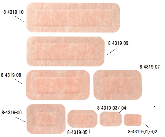 ●材質:粘着絆(基材)/PU(ポリウレタン)フィルムラミネート基材・ポリエステル不織布、吸水パッド/脱脂綿・PE(ポリエチレン)ネット(非固着性)、粘着剤/アクリル系