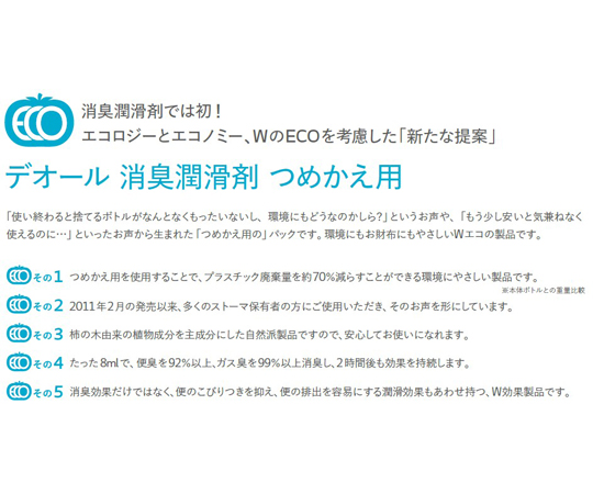 ●▼植物性消臭成分が高い消臭効果を発揮し、潤滑成分が排出をスムーズにすることで、ストーマ保有者の快適な毎日をサポートします。デオール消臭潤滑剤の消臭力・潤滑力をぜひ実感してください。