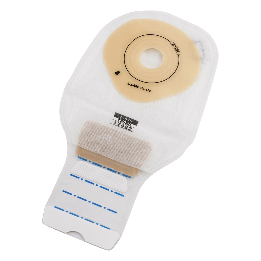 ●消化管ストーマ用。全体が平らな面板で、高さのあるストーマに適しています。下部に便排出口があるストーマ袋です。交換目安は2日。