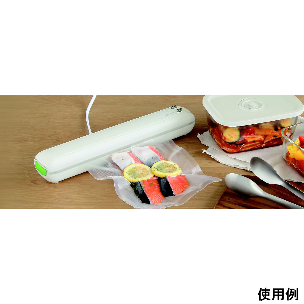 ●保存袋、別売ロールフィルムでの吸引・密着はボタンを押すだけの自動吸引。