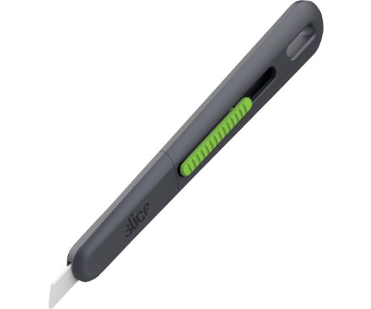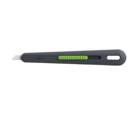 ●本体中央のグリーンのボタンをスライドすると刃先が出ます。