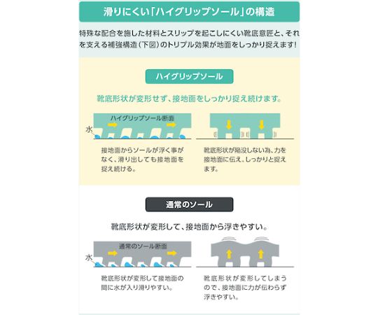 ●靴底に、油を使う環境でも膨張や硬化を起こしにくい合成ゴムを使用しています。