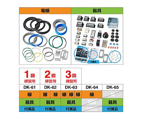 ●第一種電気工事士技能試験の候補問題全10問を3回ずつ練習できる電線・器具が入組みされています。
