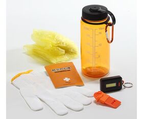 ●内容:ウォーターボトル、防災の心得、カラビナ、レインコート、軍手、COBライト、ホイッスル