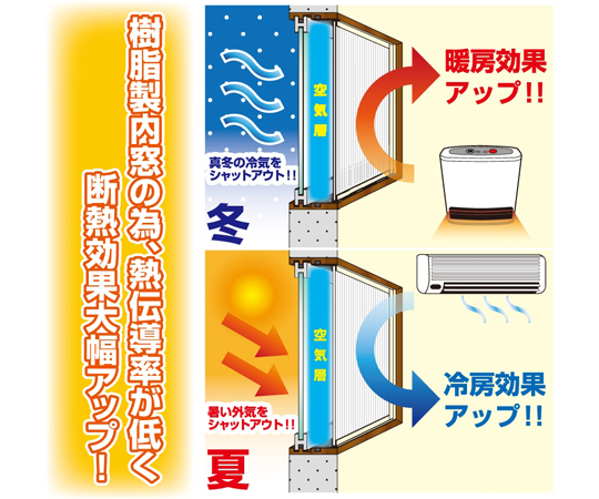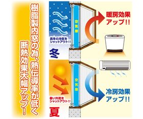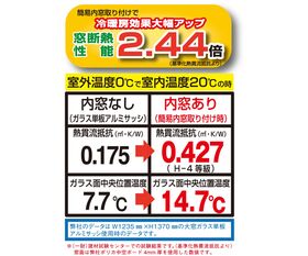 ●窓断熱性能2.44倍(基準化熱貫流抵抗より)JIS断熱等級H-4等級 光ポリカ中空ボード4mm厚を使用した数値です。(ポリカ中空ボードは別売となります。)※窓サイズが縦寸法で1000mmを超える場合はたわみ防止用のアルミ補強材(別売)をご使用ください