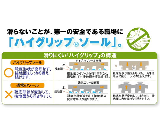●熱・薬品・水・油に強く、水や油等の付着した床面でも滑りにくいハイグリップソール。