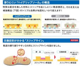 ●軽量でクッション性と耐久性にも優れ、水や油等の付着した床面でも滑りにくいハイグリップソールです。