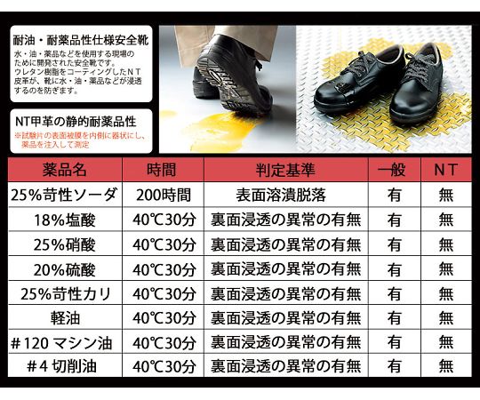 ●ウレタン樹脂をコーティングしたNT皮革が、靴に水・油・薬品などが浸透するのを防ぎます。