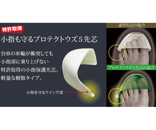 ●台車の車輪が衝突しても小指部に乗り上げない特許取得の小指保護先芯。軽量な樹脂タイプ。