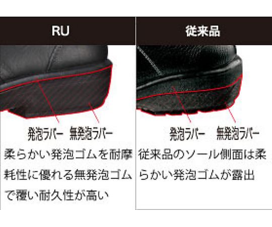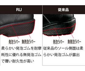 ●耐摩耗性能、耐熱性に優れた無発泡ラバーを靴底面から側面まで覆った新型ソール。優れたクッション性と耐久性を持っています。
